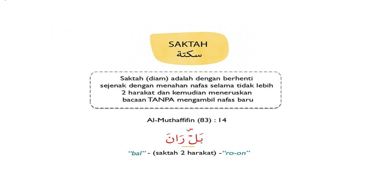 “Sekali-kali tidak! Bahkan apa yang mereka kerjakan itu telah menutupi hati mereka” (QS Al-Muthaffifin: 14). Ini adalah contoh saktah di tengah rangkaian kalimat. Hikmah adanya saktah dalam lafadz (بَلْ رَانَ) adalah menampik kesalahpahaman di telinga pendengar bahwa susunan kalimat (بَلْ رَانَ) yang berbentuk satu-kesatuan lafadz berupa (برّان) yang bermakna “dua orang yang menepati janji (bentuk ganda/tatsniyyah dari lafadz بر)”. Tentu, kesalahpahaman ini berdampak mengubah makna ayat yang dikehendaki Allah (Muhammad ash-Shadiq Qamhawi, Thala’i al-Basyar fi Tawjih al-Qira’at al-‘Asyr, hal. 10). Kedua, saktah yang memiliki perbedaan (bi khulfin ‘anhu/بخلف عنه), yaitu bacaan yang memiliki tiga cara baca (waqf, washl, dan saktah) yang berdasarkan riwayat yang diperoleh Imam Hafsh dari Imam Ashim. Bacaan saktah ini berada di dua tempat yaitu: 1. Saktah dalam akhir QS Al-Anfal dan awal QS At-Taubah: